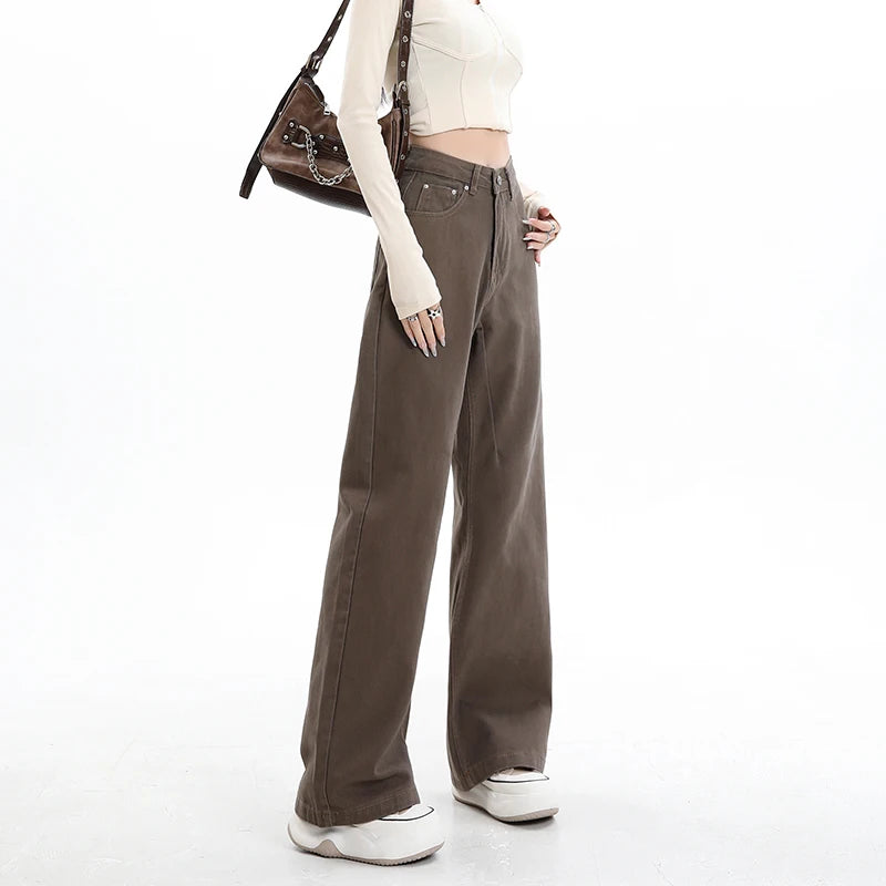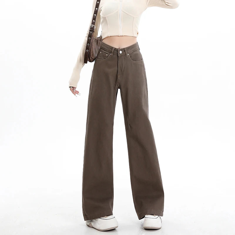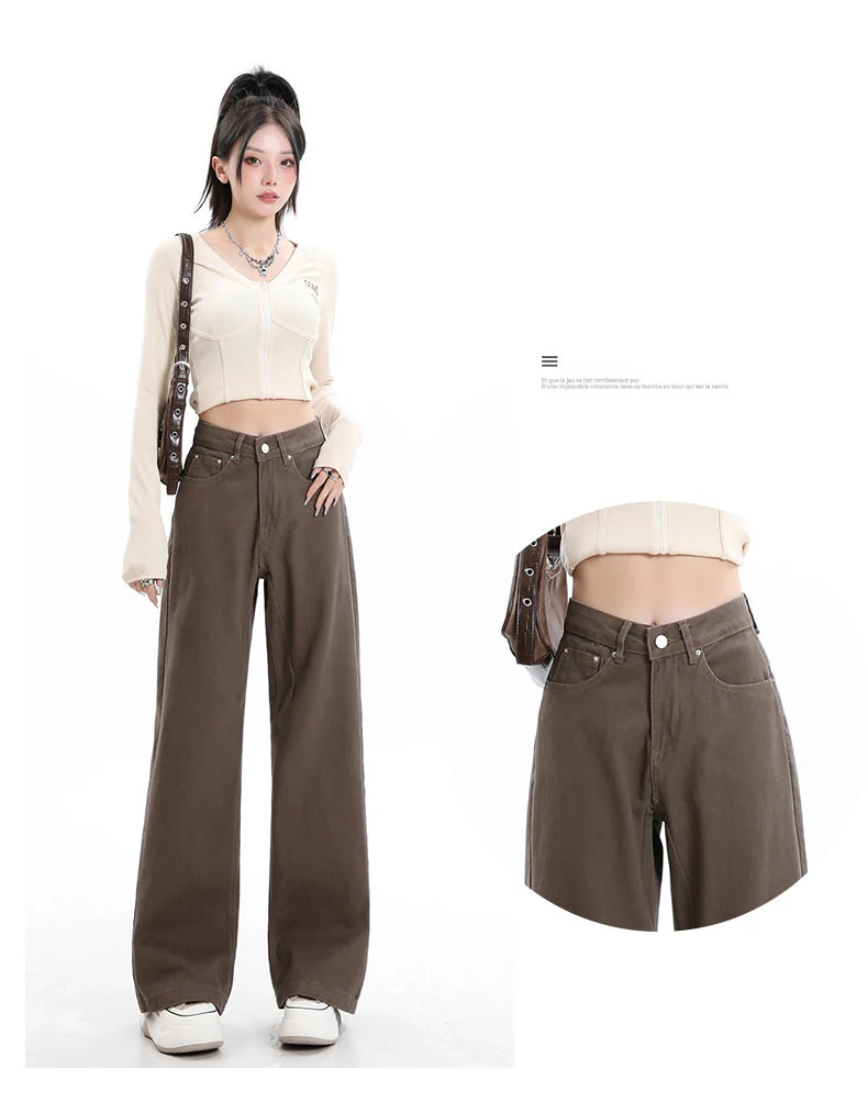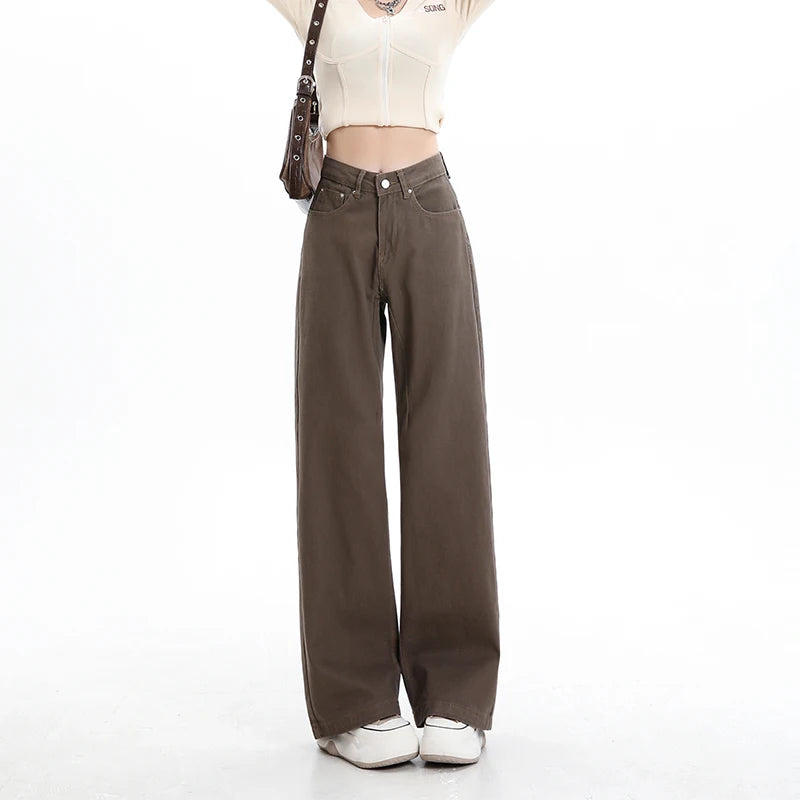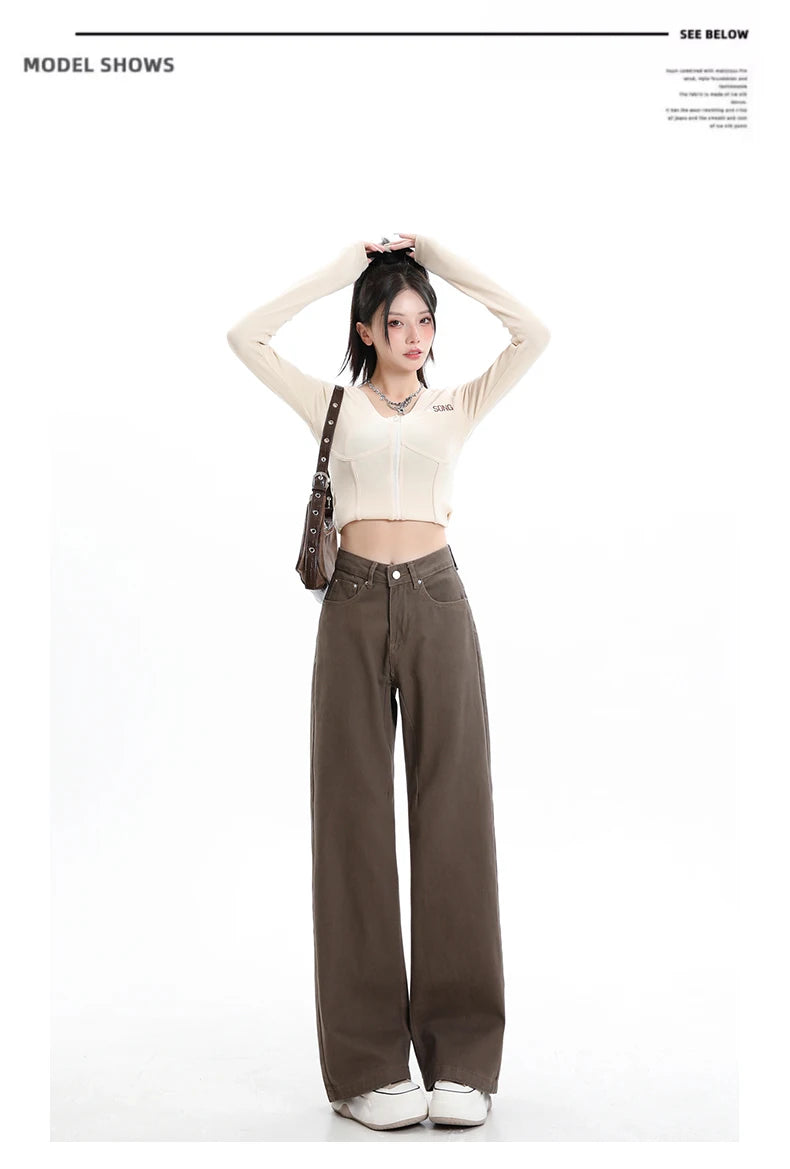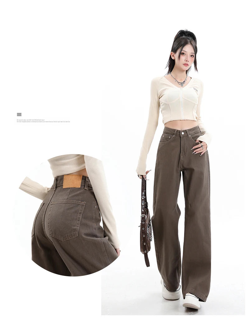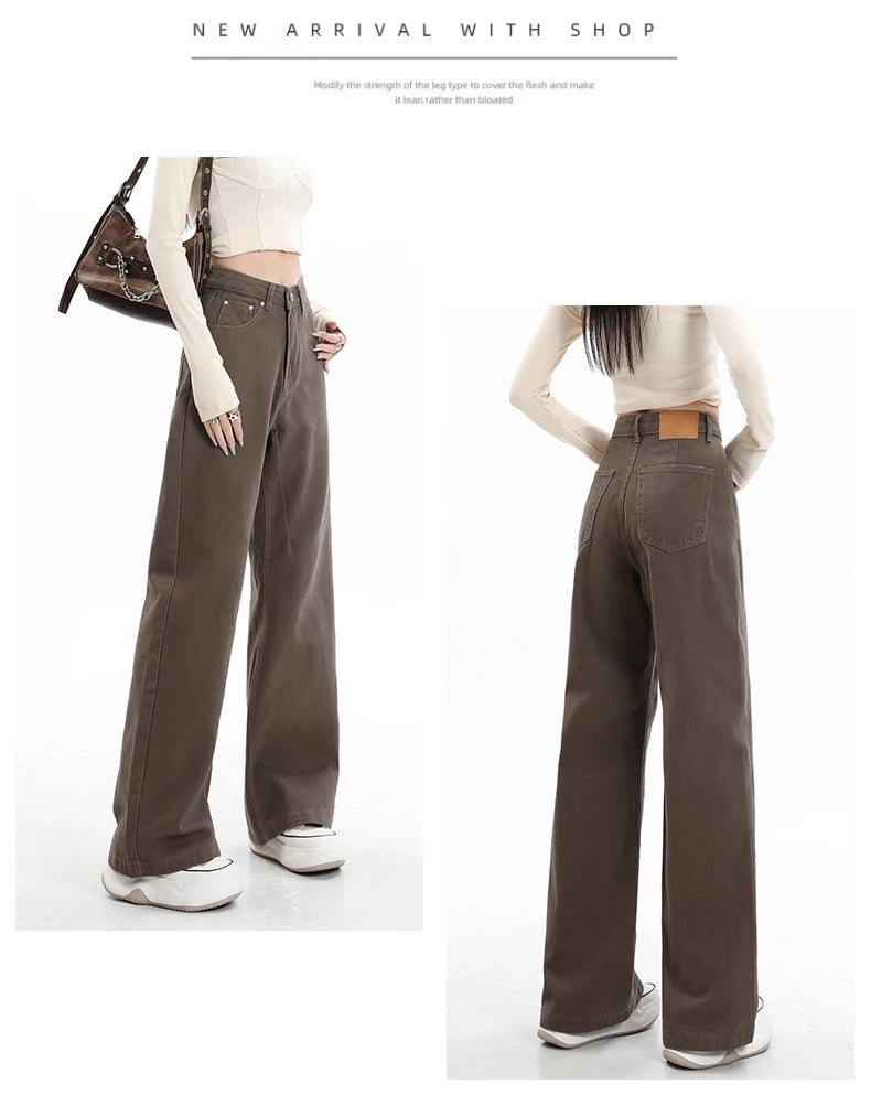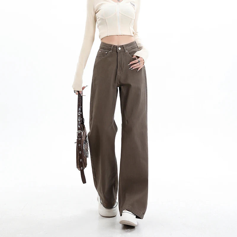 Baggy High Street Fashion Straight brown Jeans for Women's Y2k High Waist Female Clothing Solid Color Casual Wide Denim Trousers