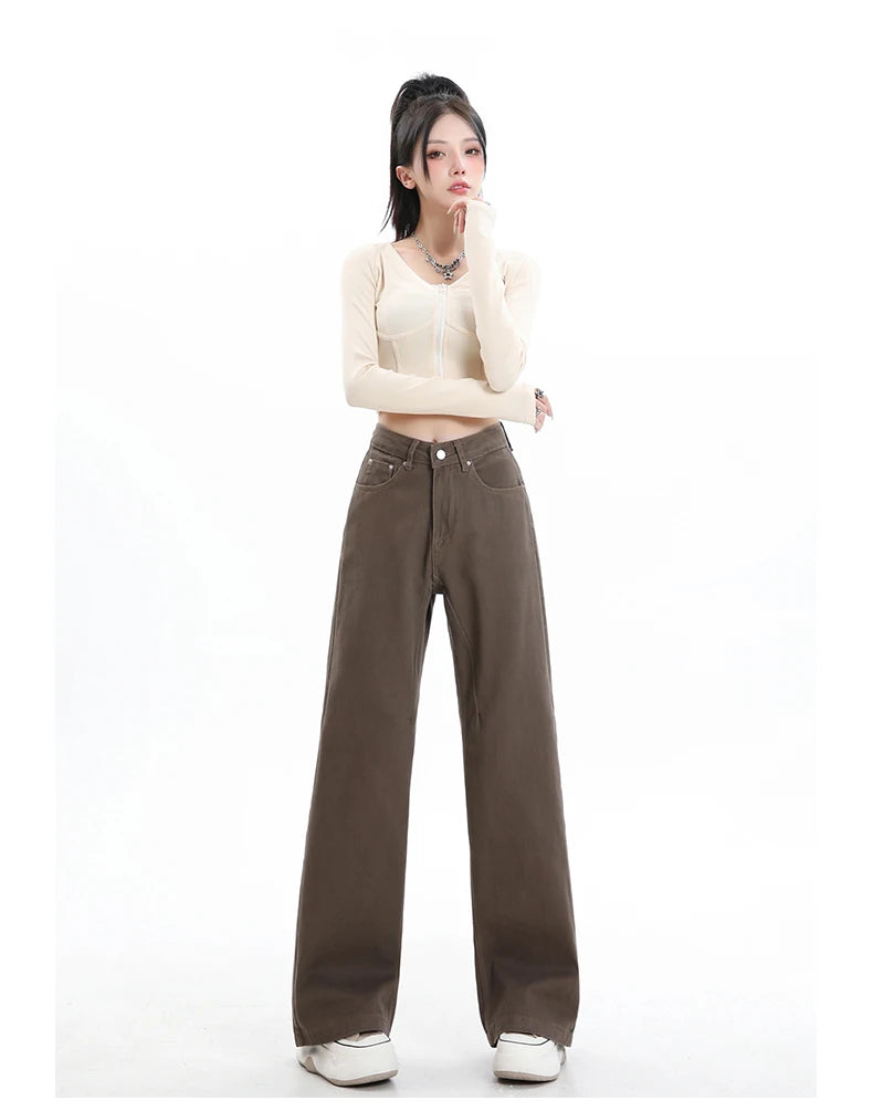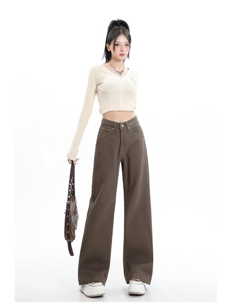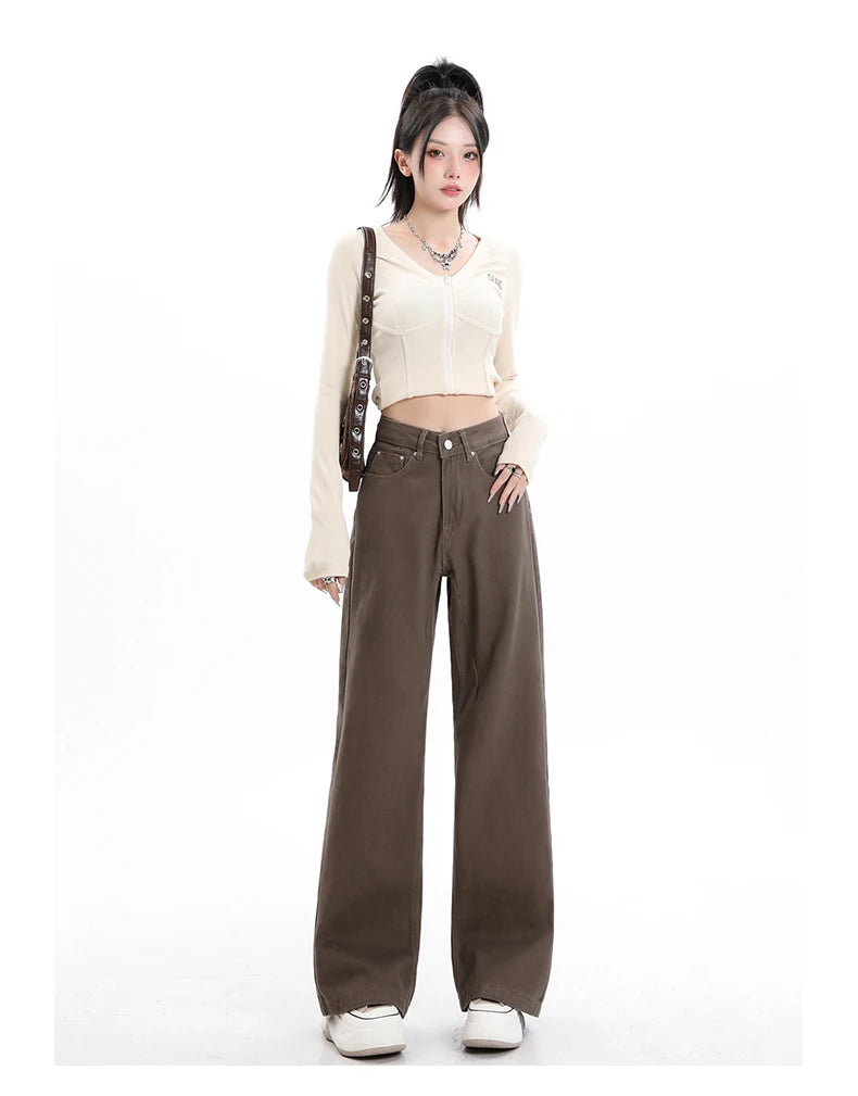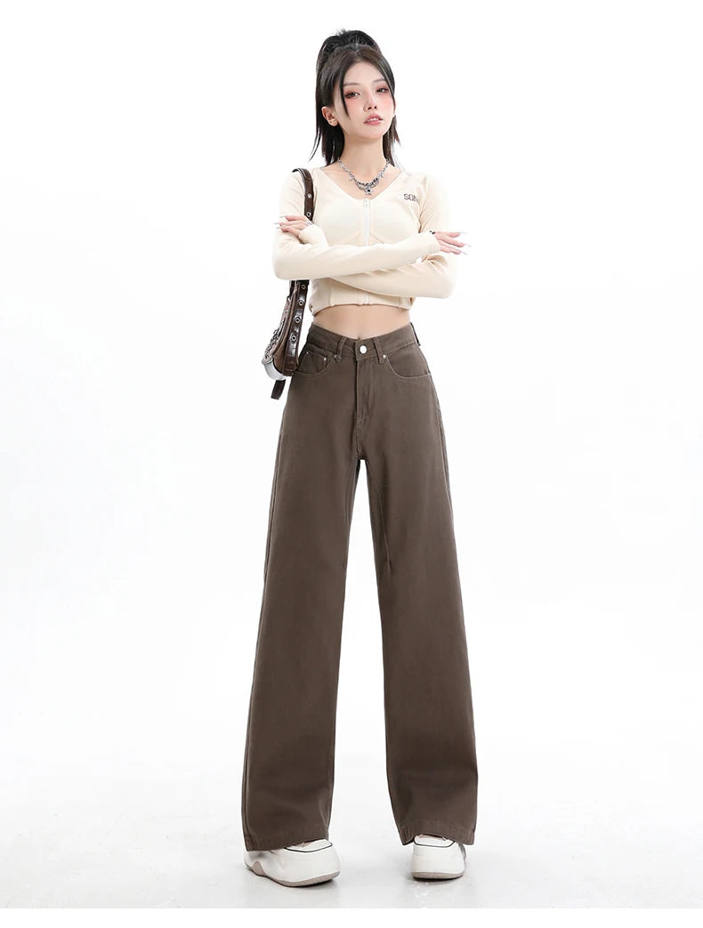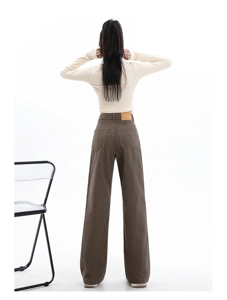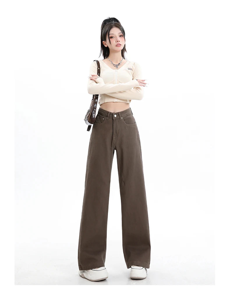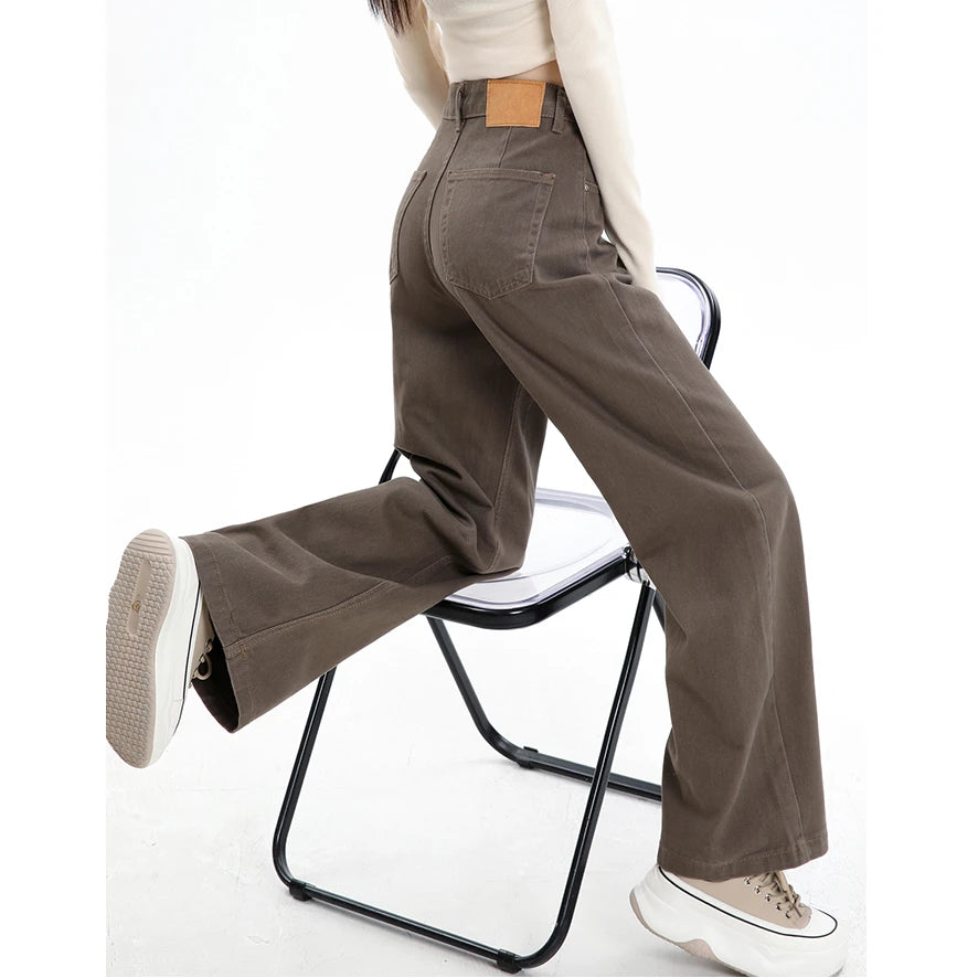 Baggy High Street Fashion Straight brown Jeans for Women's Y2k High Waist Female Clothing Solid Color Casual Wide Denim Trousers