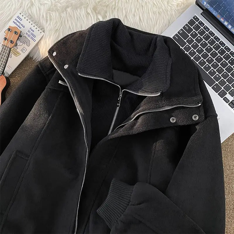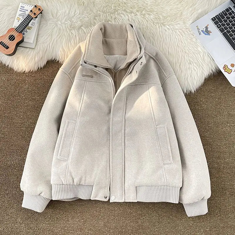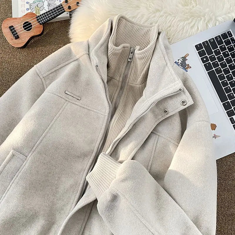 Fake two pieces woolen jackets men women spring autumn high-end feel coat Korean preppy elegant cool loose stand collar jacket